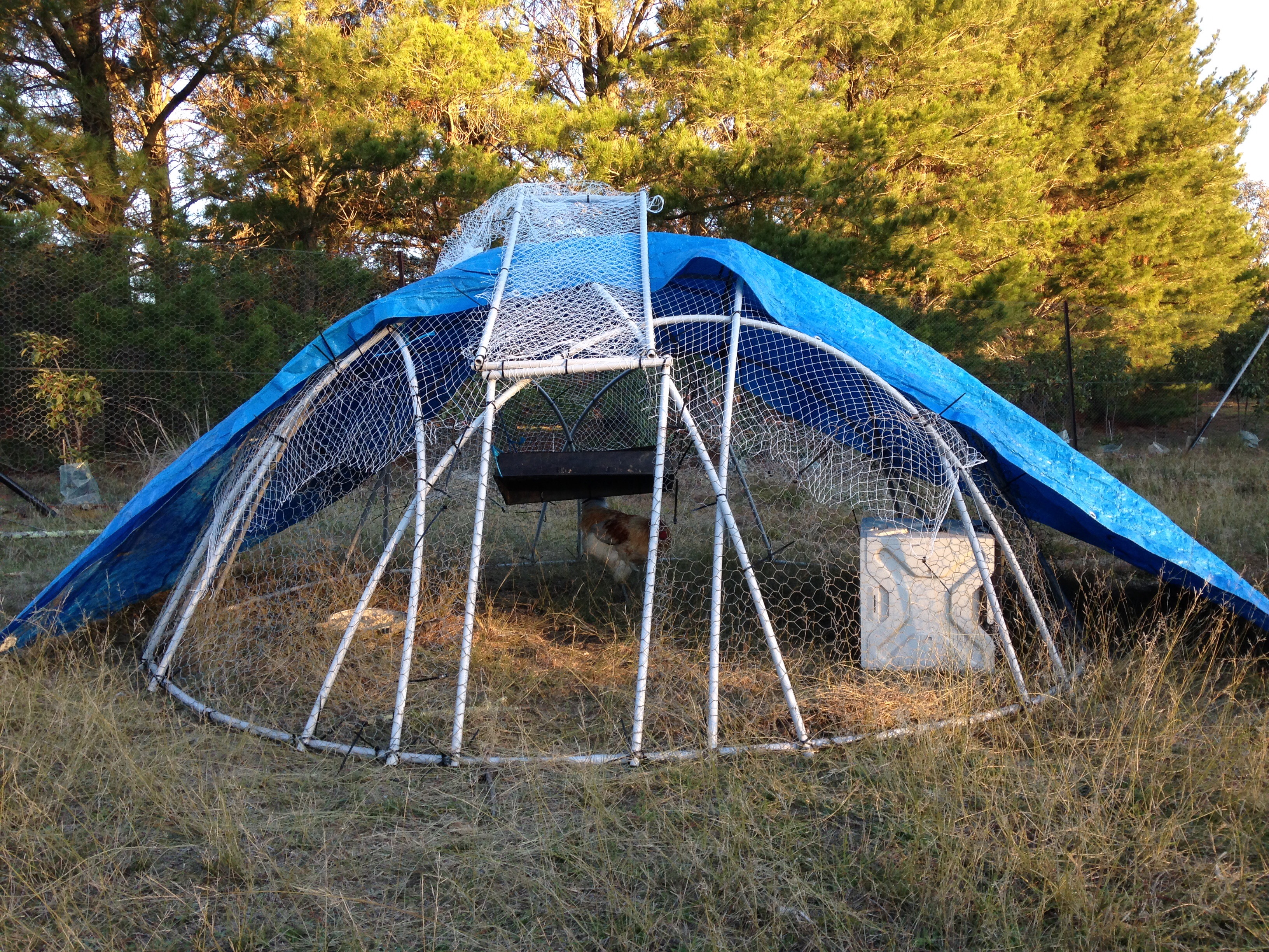 The tarpaulin isn’t fixed to the tractor – otherwise it would become a kite. It provides the bulk of the shelter for the chooks.