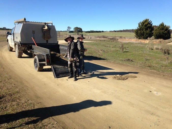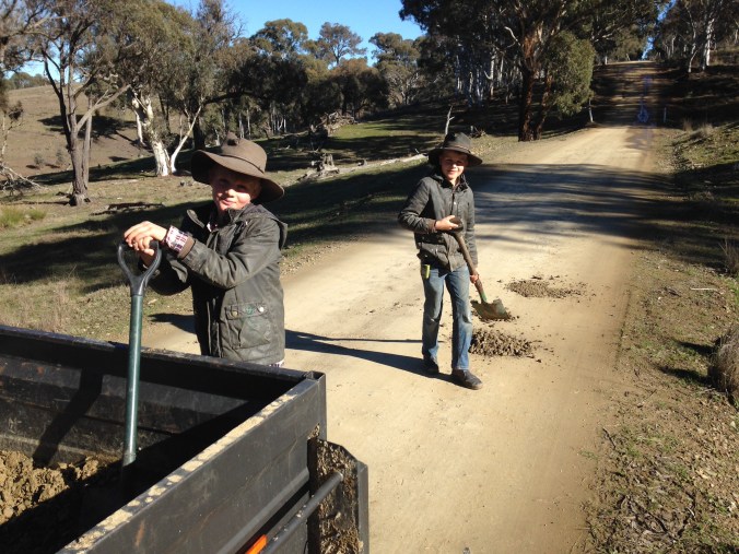 Our neighbour David owns a tractor and has a gravel pit on his place. David’s tolerance of pot holes is even less than mine, and he regularly fills in some of the worst of the holes on the road. His efforts are very much appreciated by all of us, but it was time that the Little Helpers were recruited to bolster the road maintenance program.