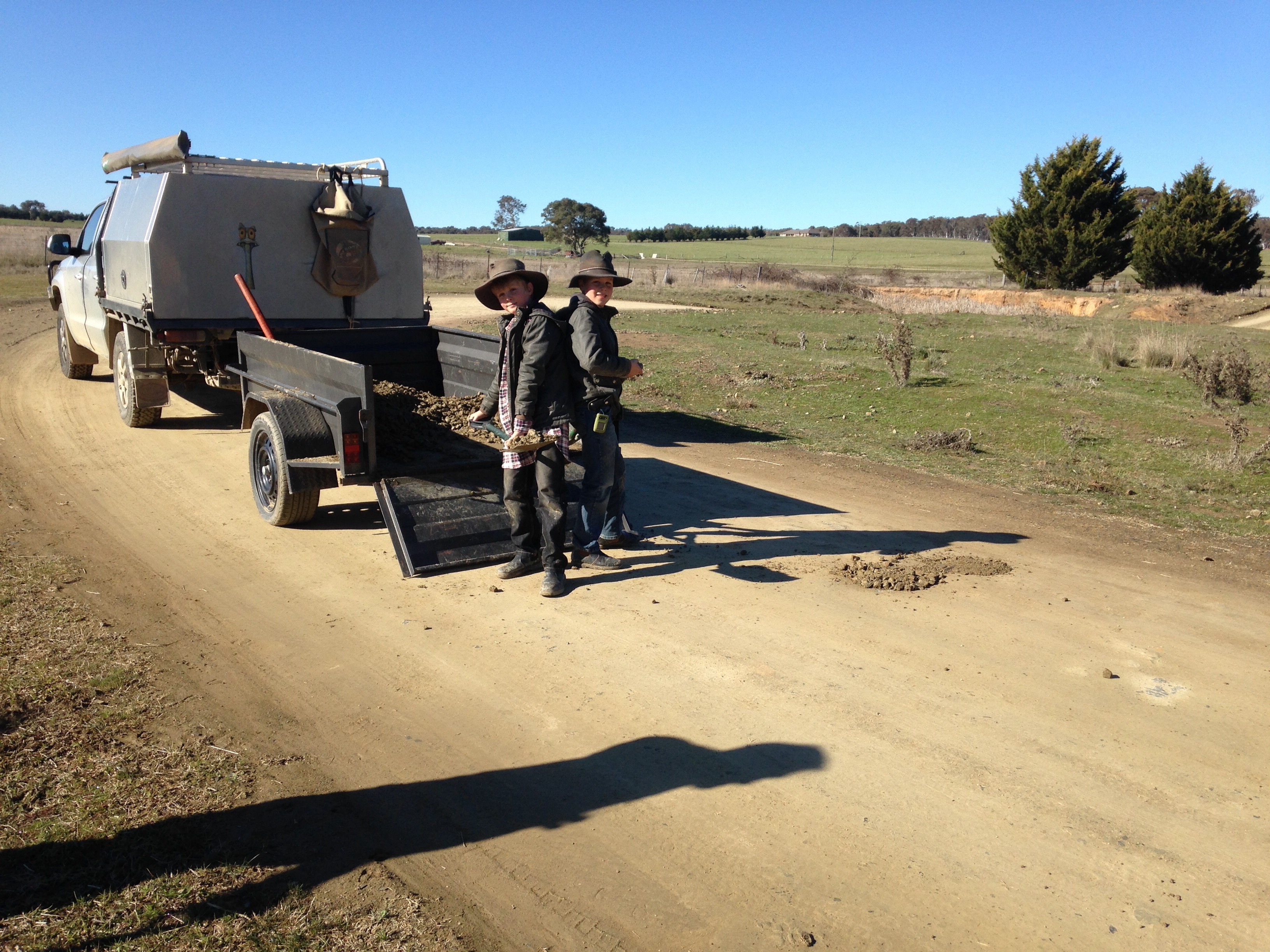Our work here is far from completed. After emptying the trailer in the worst of the road, we dropped it off at David’s, with a ‘fill it up please’, so we can do it all again. I hope the Little Helper’s enthusiasm remains for the next load… and the next… and the next. 🙂