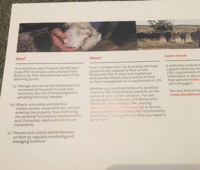 I recently received in the mail a letter informing me that I was required to develop a biosecurity plan for the Rock Farm. This is part of the Livestock Production Assurance (LPA) program, which Australian meat producers are encouraged to participate in.