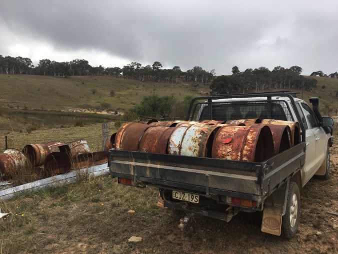 Our aim is far more simple. We would like to see some of these trees grow on our property. Our first job was to collect some old 44 gallon drums that would form tree guards and protect the young trees from rabbits. Every farm has a ‘resource centre’ and we just had a wonderful collection of old half 44 gallon drums that had the base cut out.