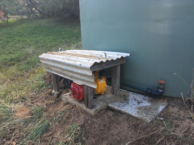 Another of those little challenges that comes from living on tank water popped up a couple of weeks ago. Our potable water situation is a little complicated. The house supply is gravity fed from a couple of 22 000 litre tanks that harvest water from our shed. Water harvested from our house roof is stored in another 22 000 litre tank in our garden. There is a fall of some 15 metres between the garden and shed tanks, and I had no pump to transfer water from the garden tank up to the shed (house supply) tanks.