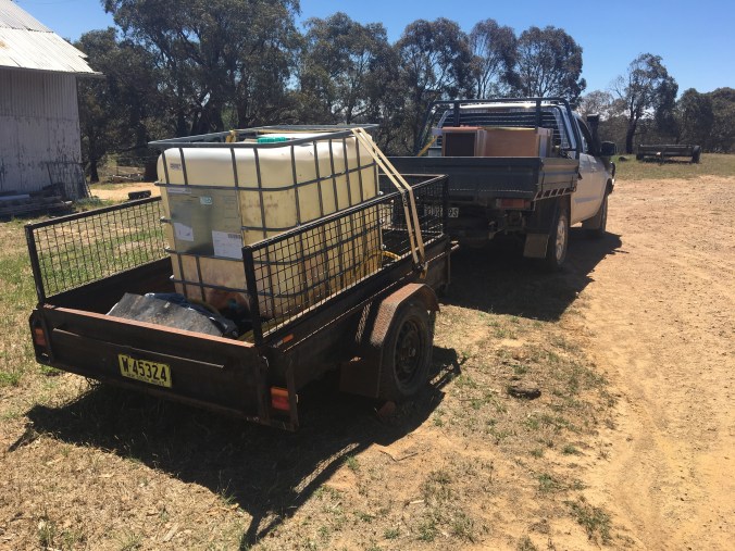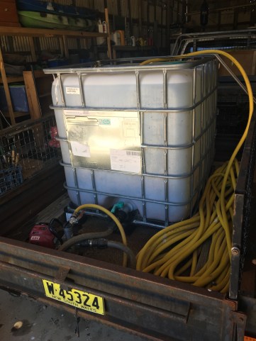 One part of our fire plan is the ability to put out small fires with our own private appliance. To this end, we have fitted an IBC 1000 litre tank with a small Honda pump to an old trailer.