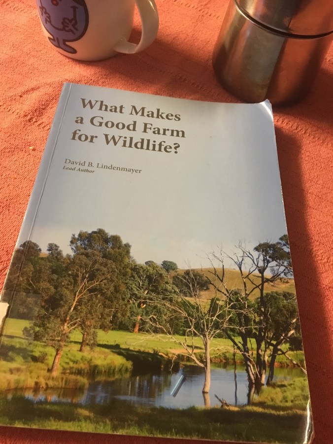 Whilst What Makes a Good Farm for Wildlife is no longer in print, I borrowed a copy from our local library. David Lindenmayer is a prolific author, and he has recently published Restoring Farm Woodlands for Wildlife (2018) which appears to build on this earlier book. If you’re interested, it is available at the CSIRO Publishing Website here: https://www.publish.csiro.au/book/7844