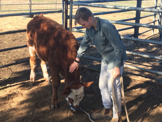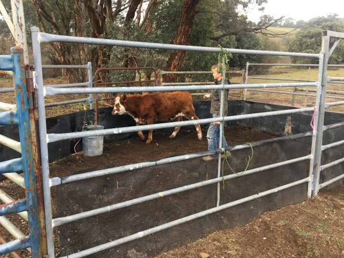 He is now old enough to be weaned, and the (not so) Little Helper decided his school holiday project was to break the calf into halter. We did point out to him that whilst it was our responsibility to give him the best life we could, ultimately his purpose is to be processed into beef… We agreed that we wouldn’t do this on our place.