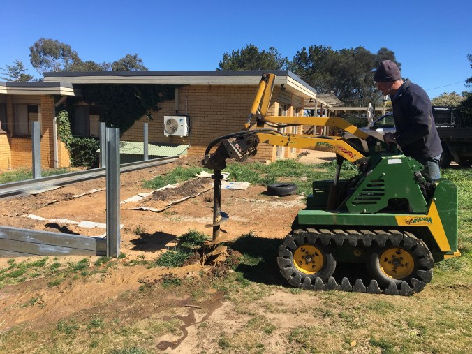 If you do want to find water though – I would highly recommend hiring a Kanga. Jimmy and his marvellous machine have an amazing ability to find water pipes. After successfully digging holes for our carport foundation, we decided to make the most of his visit with a couple of extra post holes for gate posts…. it was the last hole (it always is) when the auger came up with water pouring out of the hole…