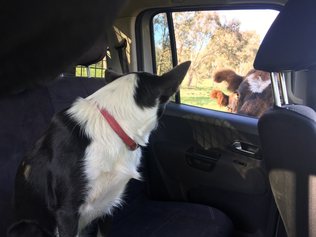 The girls settled quickly into their new paddock – however I needed to duck down and make a small repair to their water trough. The cows not only came over to check out my work, they also gave poor Sapphire the border collie cross a fright. She didn’t know what to do when some gentle (but very big) brown faces came snorting through the window. She placed herself very much in the middle of the seat, as far away from the open windows as she could and kept a very close eye on the inquisitive bovines.