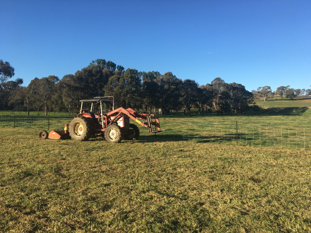 The old tractor and mulcher make short work of the weeds and it doesn’t take long for the paddock to look like a lawn. The mulcher also breaks up dry cowpats and leaves the clippings to mulch back into the soil. Using this process I hope to slowly increase soil microbial activity, and encourage productive grasses to out-compete weeds. This technique has been effective against thistles so far, and whilst there are still plenty of weeds in the paddock, I am loathe to use chemicals to control them.