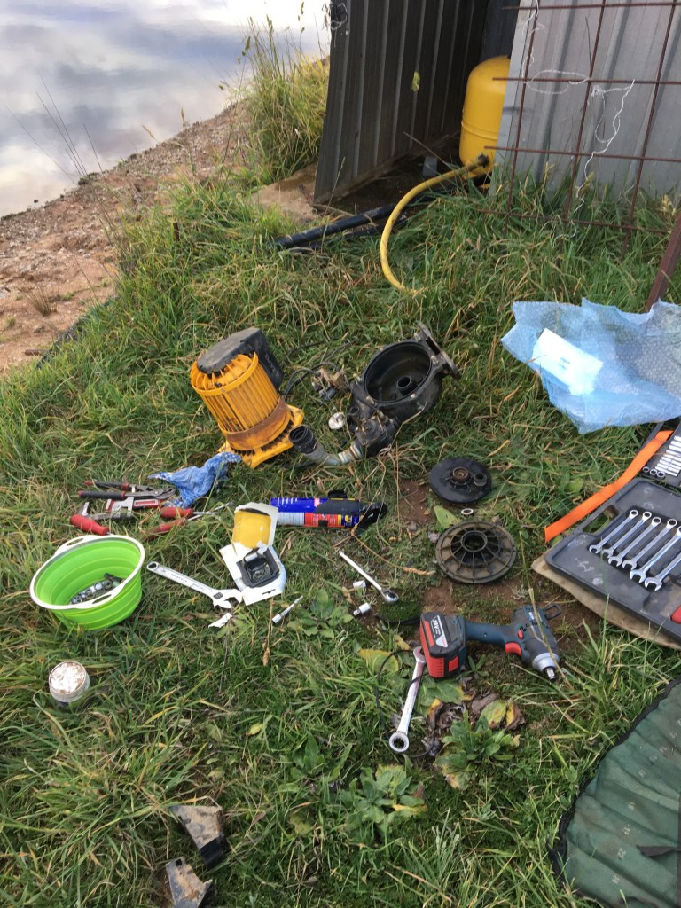 Parts for the pump arrived in our absence, so I set to work the next morning, following the troubleshooting sequence from the owner’s manual. It took a while to figure out how to pull the old impeller out (it looked fine). I replaced the bearings and seals and put it all back together. It seemed to make all the right noises – but I still had the same problem – the pump couldn’t raise enough head (pressure) to reach the house.