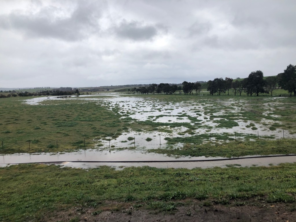 This photo is taken on the same post as the photos above…. a massive transformation. The water from the dam overflows down a channel into a creek. Even that overflow drain couldn’t cope, and our flat was covered with standing water. Just stunning. Especially when you compare it to the scenes we were facing in summer a few short months ago: https://rockfarming.com/2020/02/03/weaning-and-a-rough-plan-for-the-cattle/