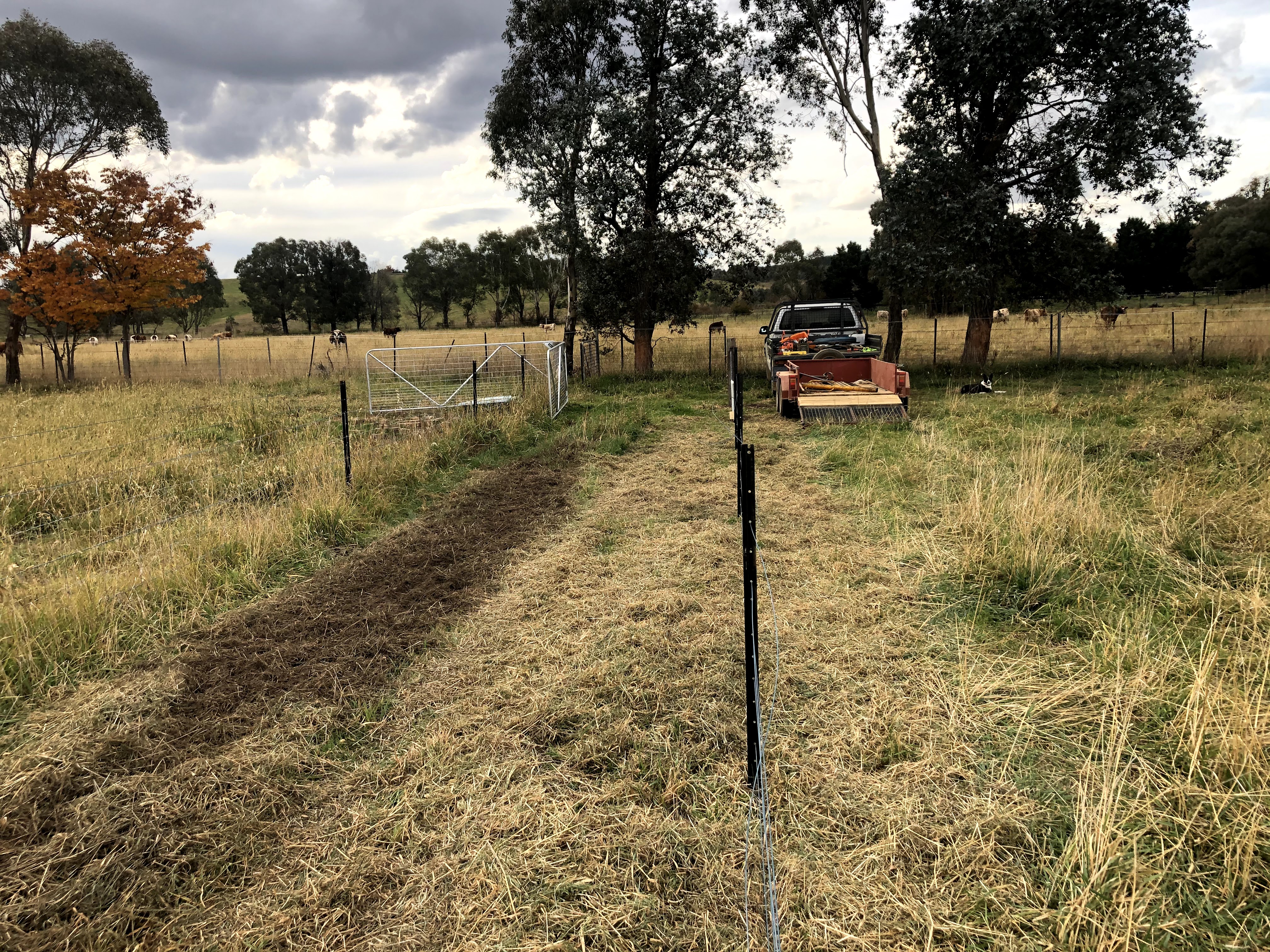 If this is your first time reading our blog, you might be asking why I haven’t planted native trees along these fence lines. The answer is complex and it relates to our desire to create a productive farmland that is in balance with nature. We are not trying to re-create the landscape as it was prior to European settlement. Rather as our climate gets hotter and dryer, we believe that large deciduous trees will help shelter our property from the extremes of the weather. We have some beautiful Elm Trees (Ulmus Procera) that are at least 150 years old near an old stone cottage ruin. Their shade and mulching leaves make this area the coolest part of the property on hot days
