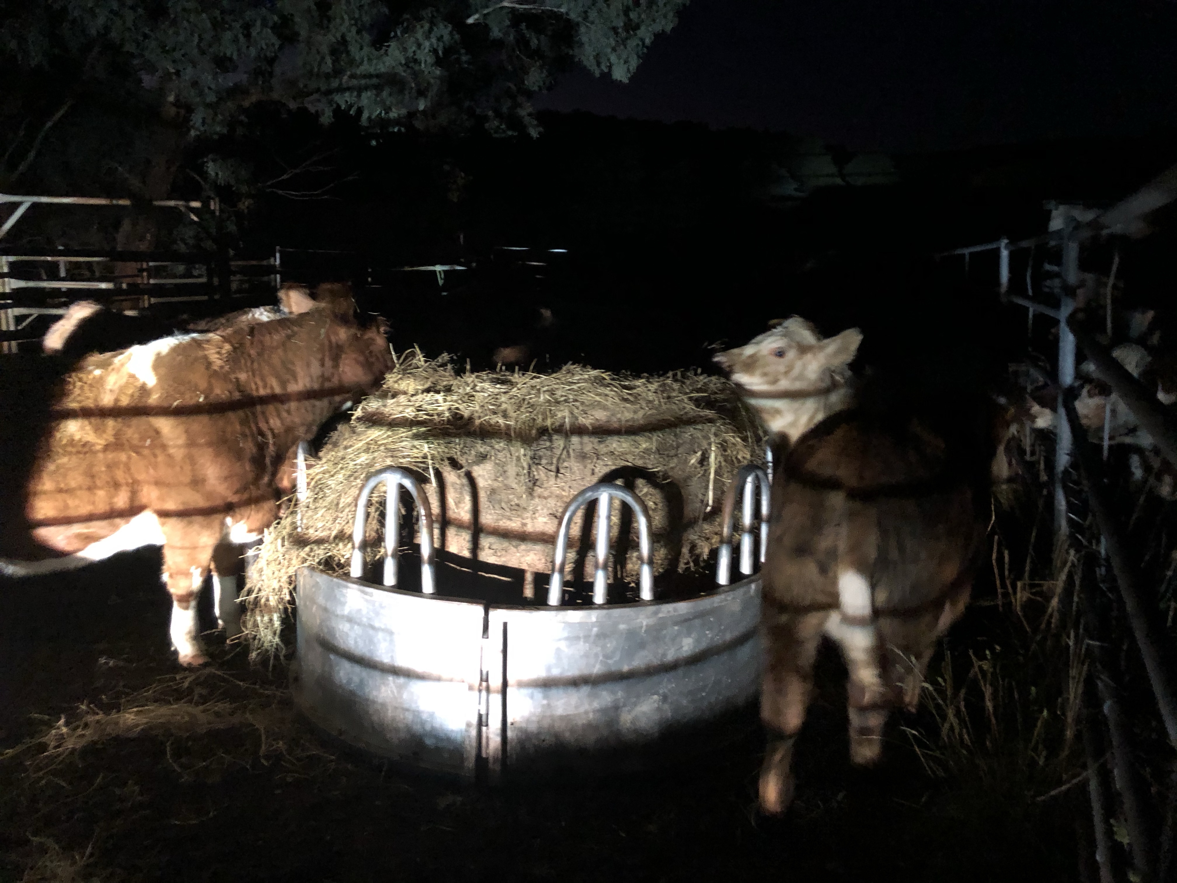 Weaning can be a stressful time for young calves and their mothers. So I left with the calves our four maiden heifers and Miss-Steak, one of our original herd who didn’t calve this spring. The initial separation seemed to go well. The calves, secured in the yards followed the lead of the older cattle and started enthusiastically feeding from our round bale feeder.