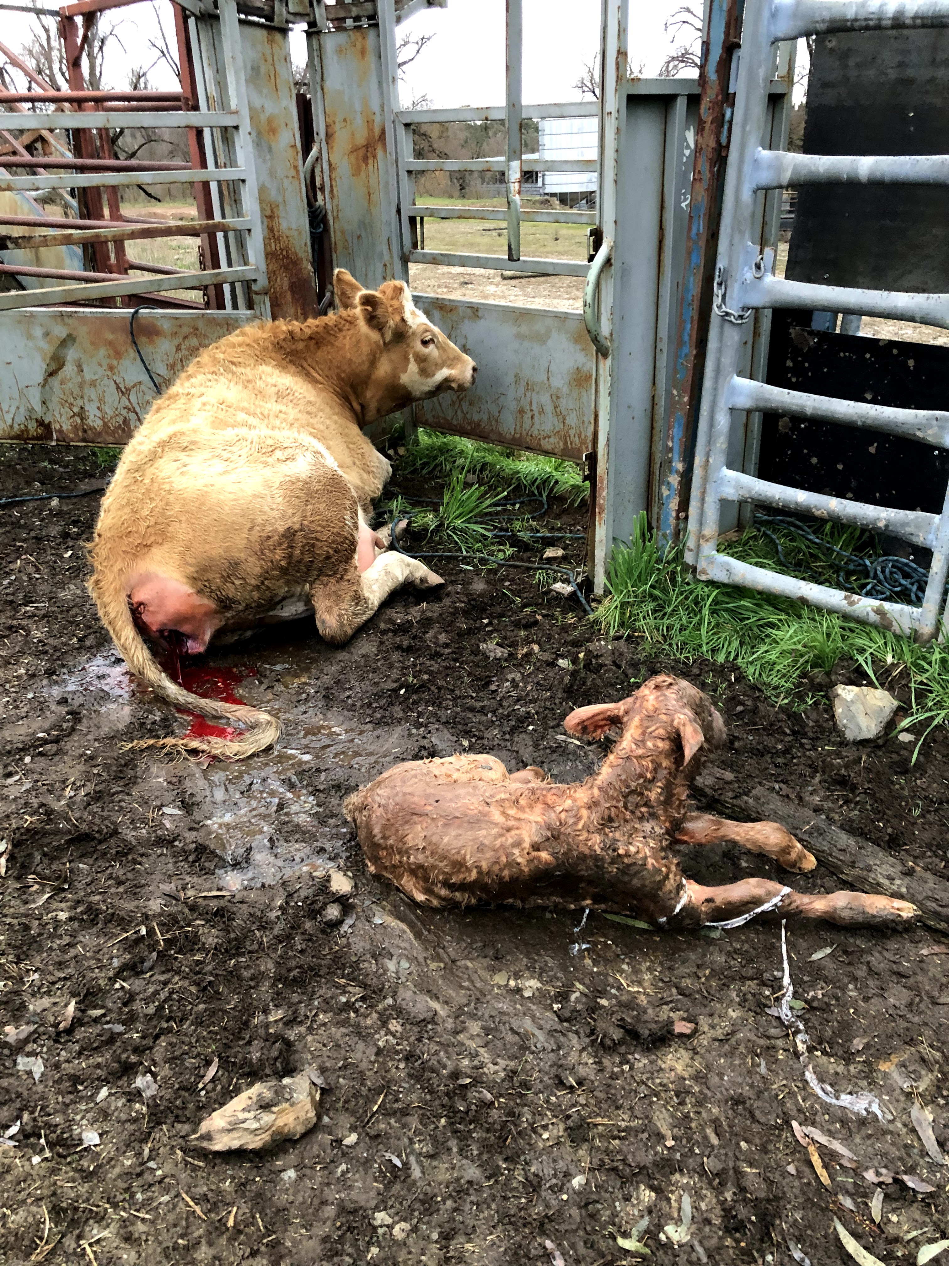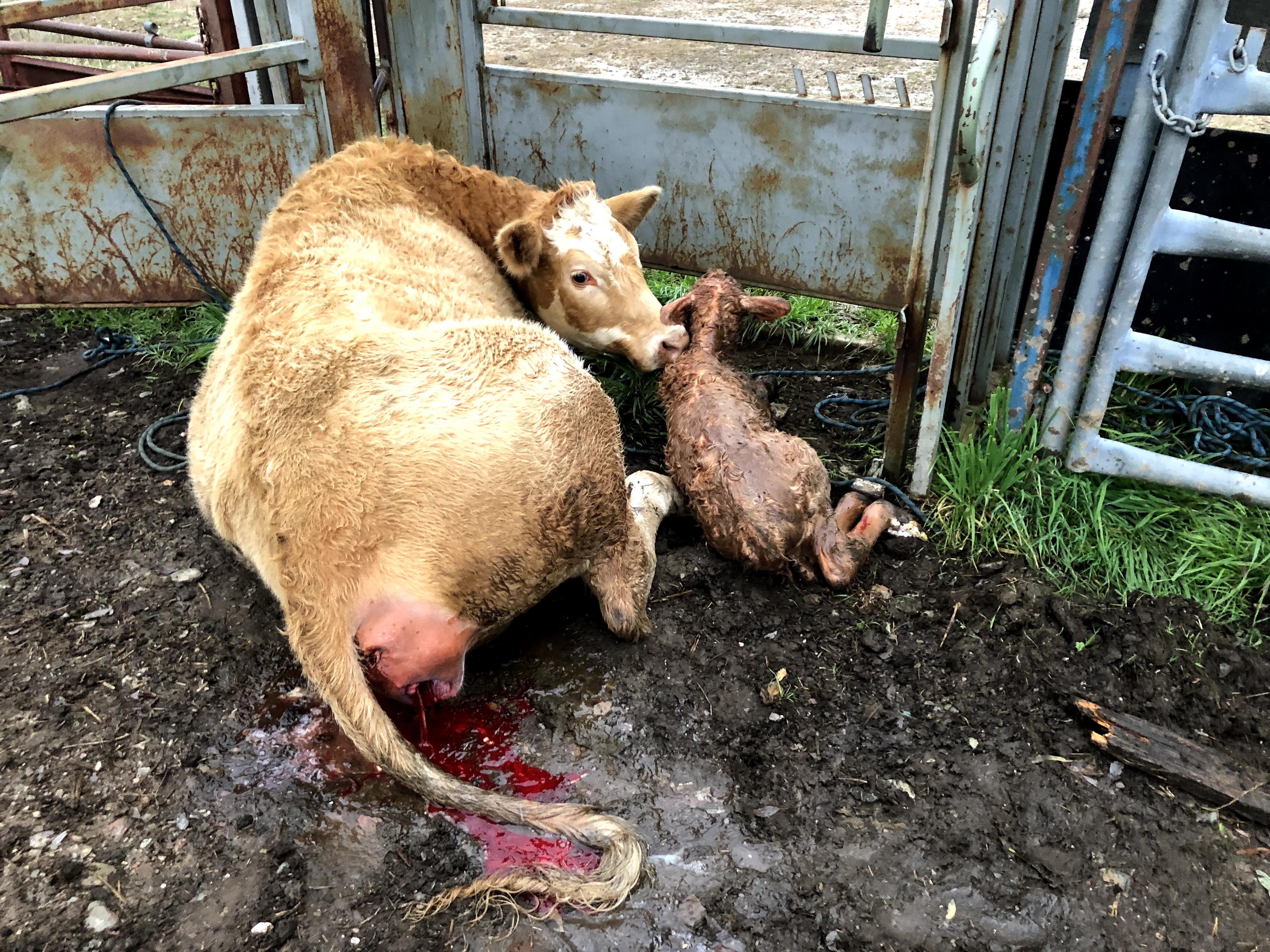 Protruding from Daisy’s rear was one hoof and a calf head, with its tongue hanging out. The calf’s tongue was a blueish colour, and there were no signs of life. I knew we had to get her in the yards, try to pull the calf and see if we could save Daisy. Despite our efforts, Daisy had no desire to leave her friends. It took all of us a lot of initially gentle and then more forceful encouragement to get her in the yards. By the time we got her safely secured in the crush, we were all exhausted.