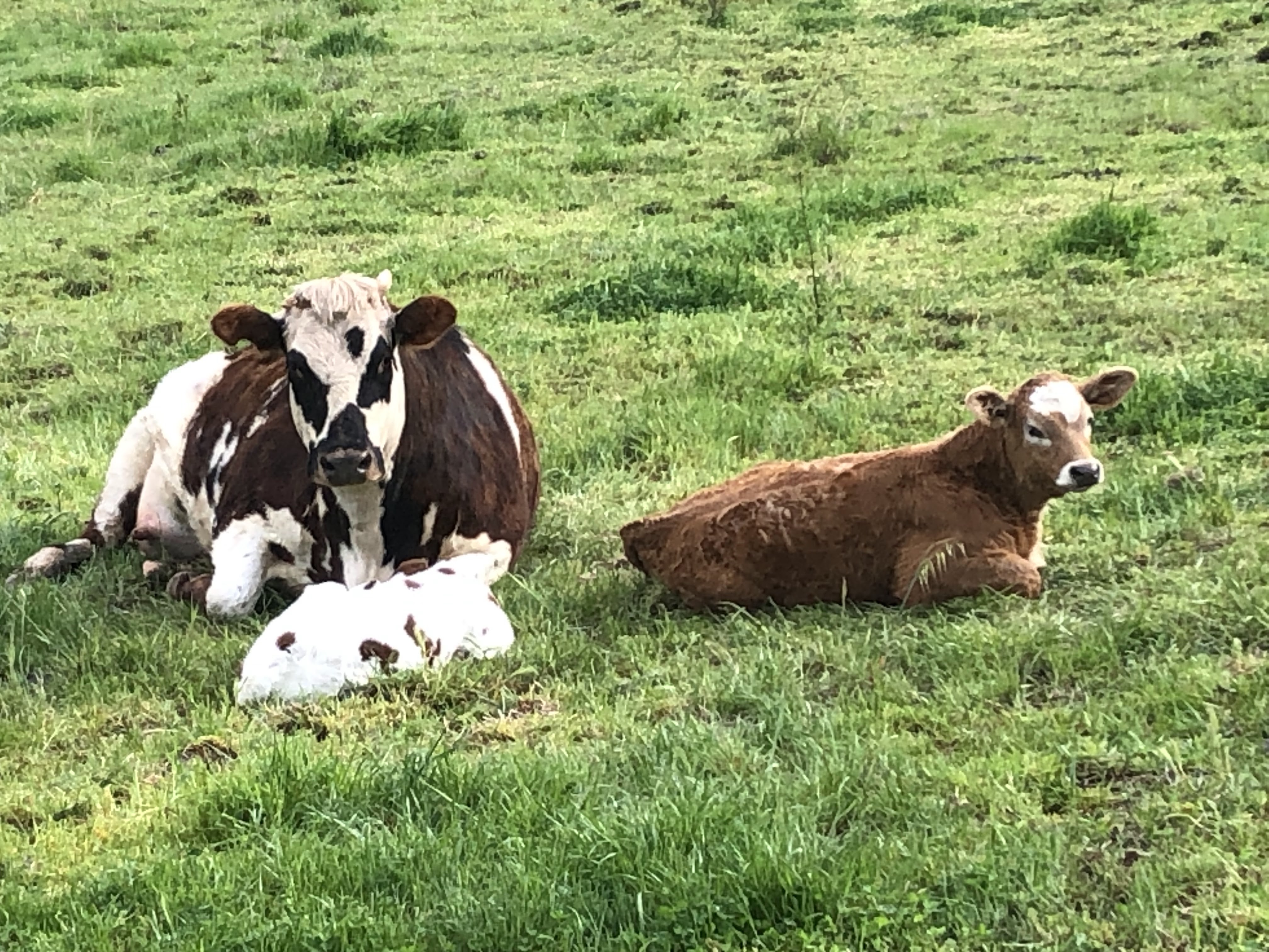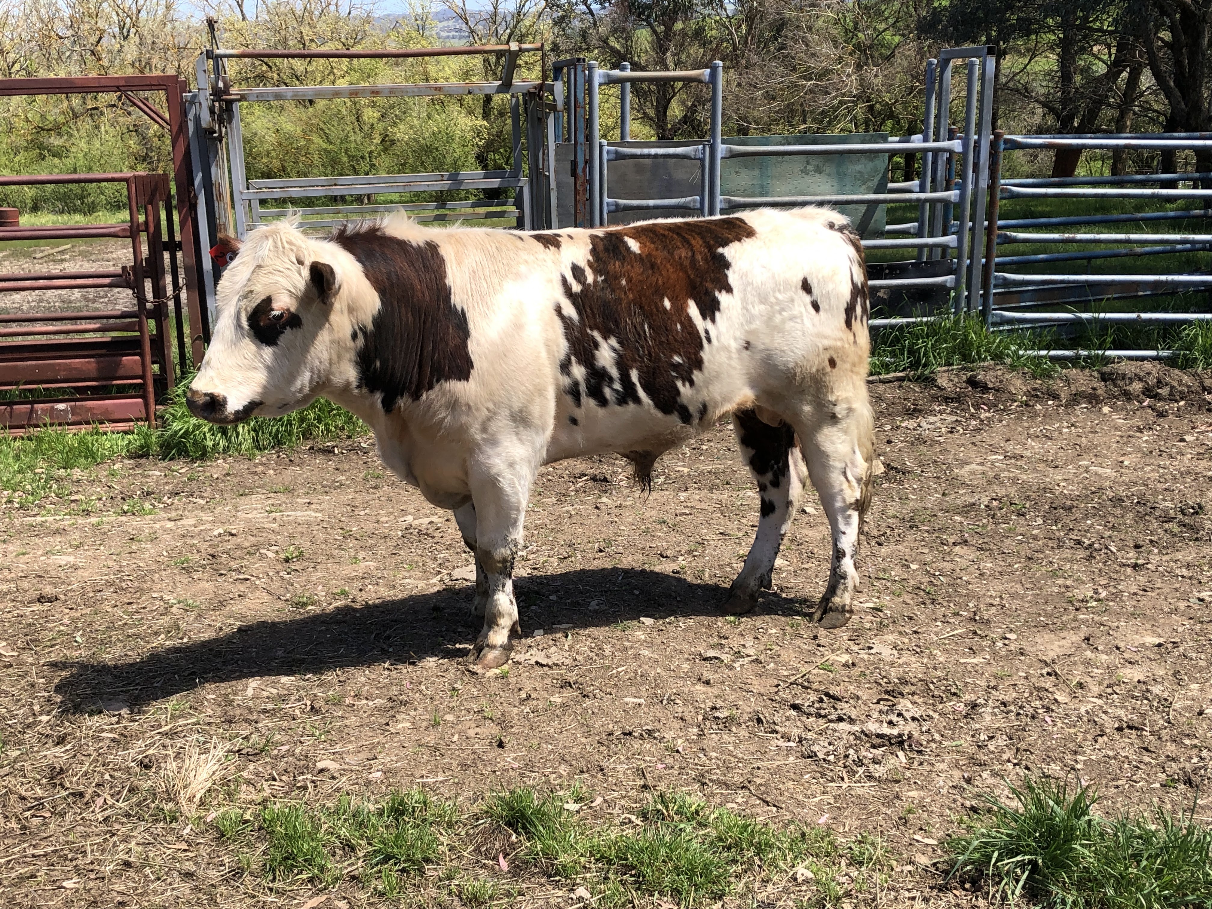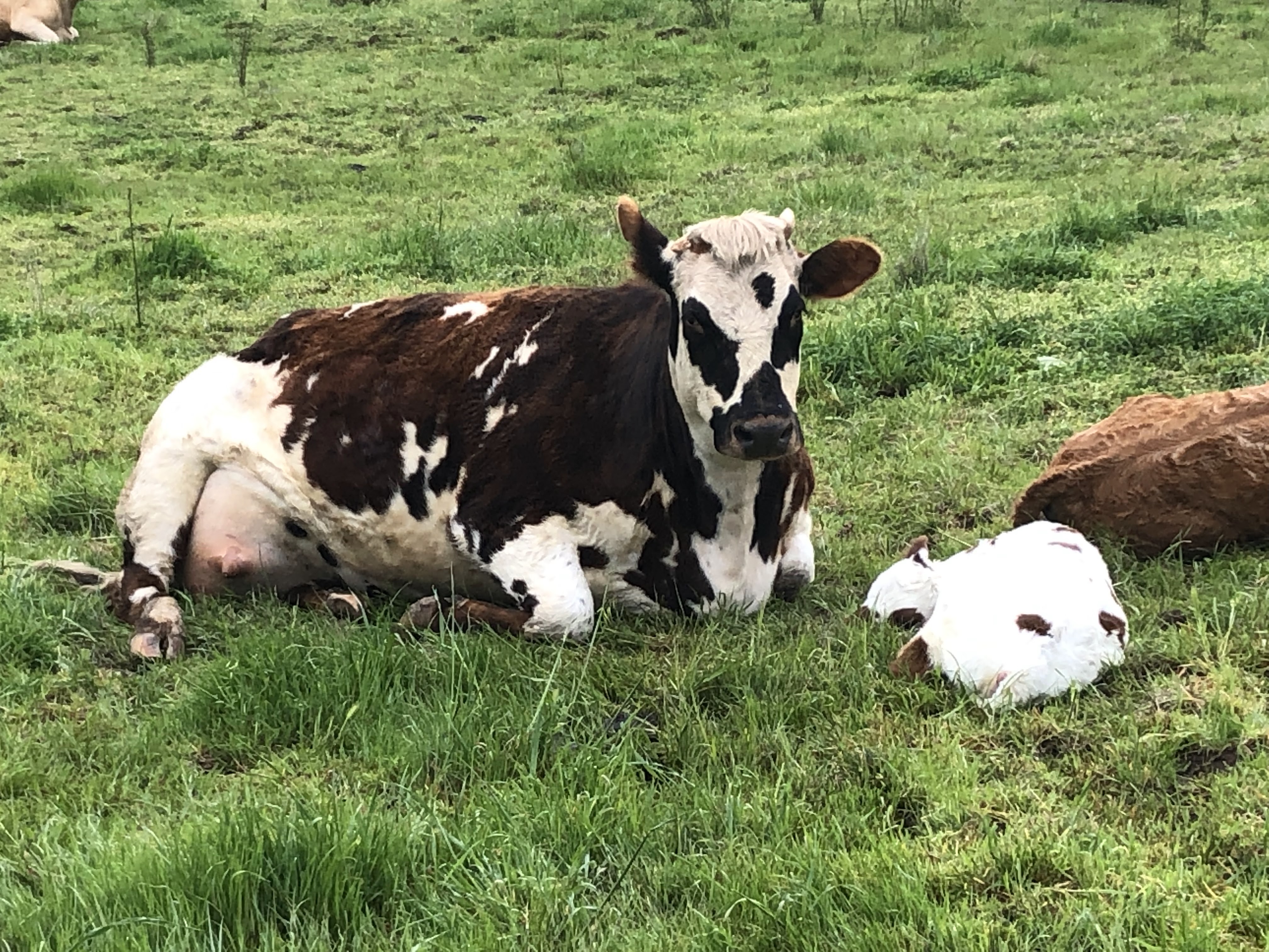 Jimmy happily accepted the change in cartage plans and we picked up our borrowed bull a couple of days later. This magnificent fellow shows is French Normande herritage with his markings and his length. He is also really quiet, and happily settled in with the girls. This year we are joining our 15 cows and 1 heifer with this fellow. They will be due to start calving late July, which is a little early for us, but with the season starting so well, we can only hope it holds.