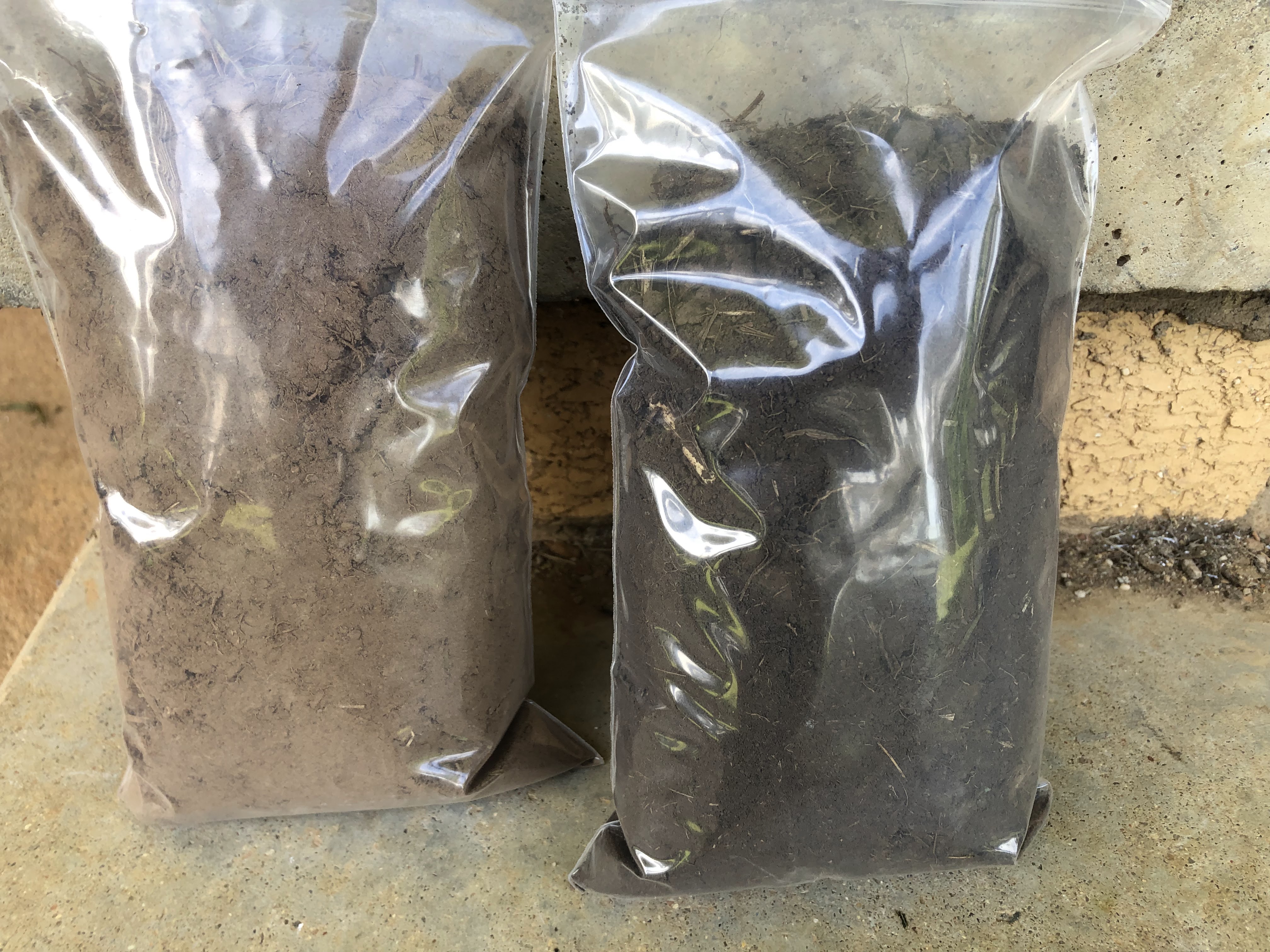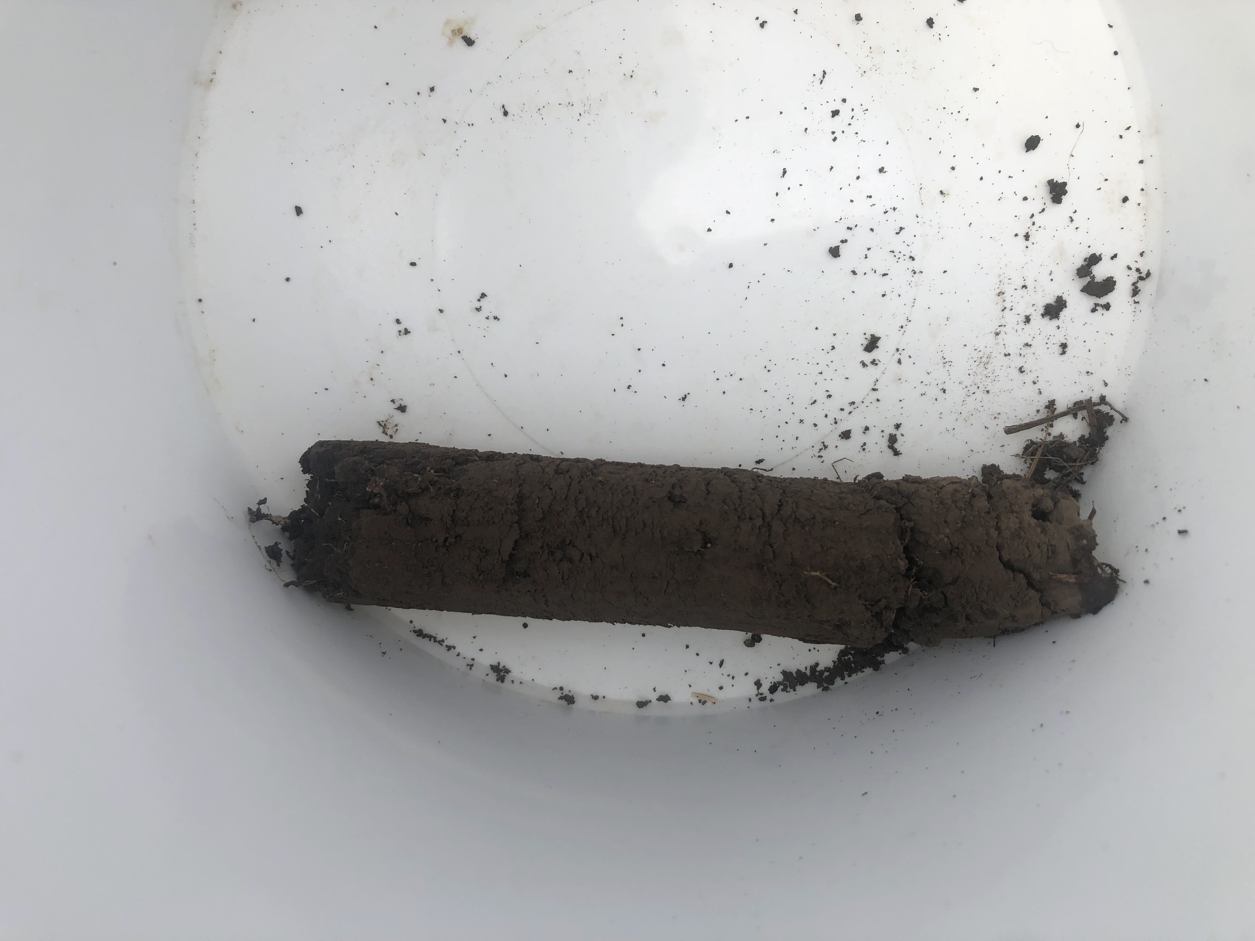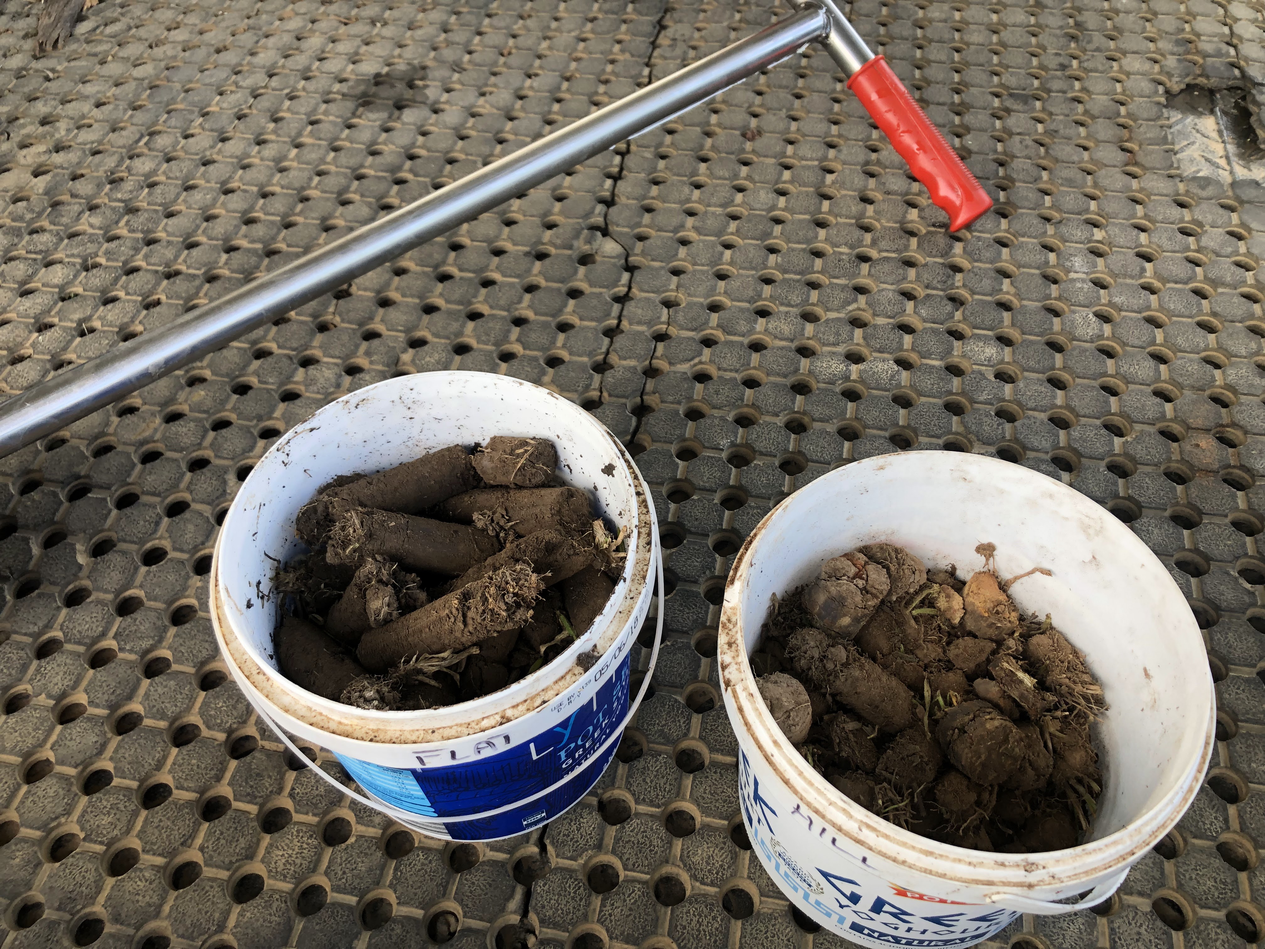 The soil samples require multiple (around 30) 100mm cores to be taken along a transect. I chose two different areas, the first on our river flats, and the second on our shale slopes. Along the flats, the rod was easy to push in the required 100mm. On the slopes, the soil was barely more than 50mm thick, and I had to try really hard to find enough samples that met the 100mm requirement. After I had filled the buckets, I mixed the soil thoroughly, before bagging around 1.5kg of soil for testing. The colour difference in the soil samples was remarkable, but not unsurprising.