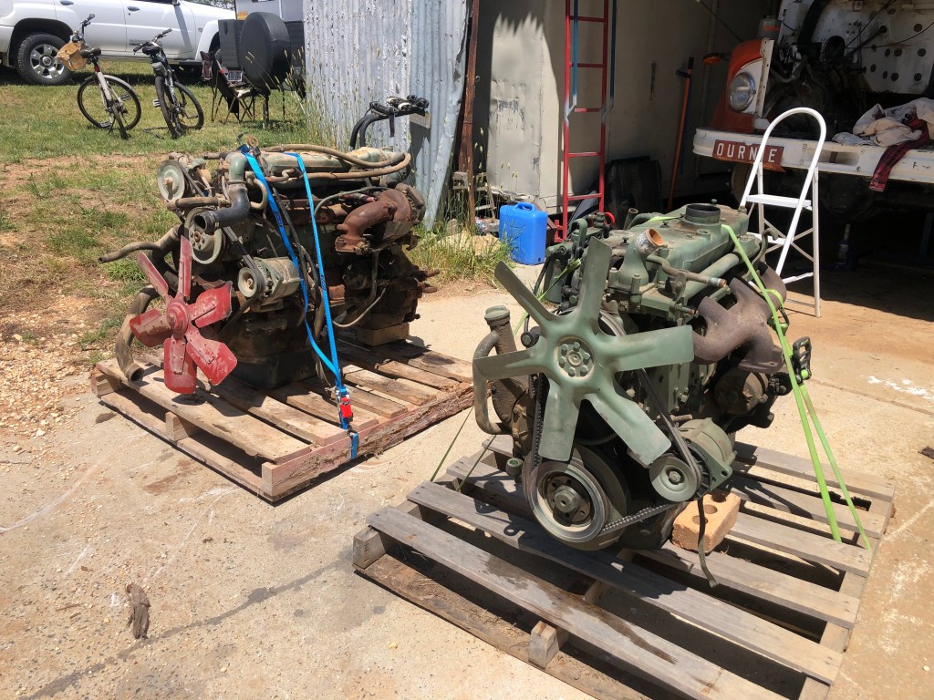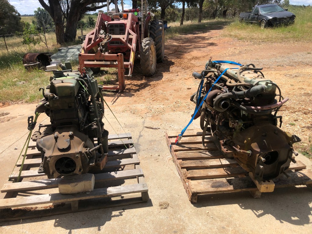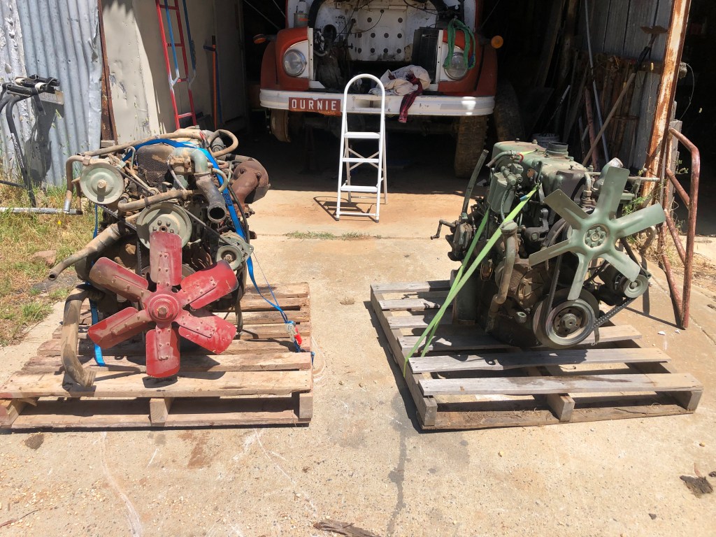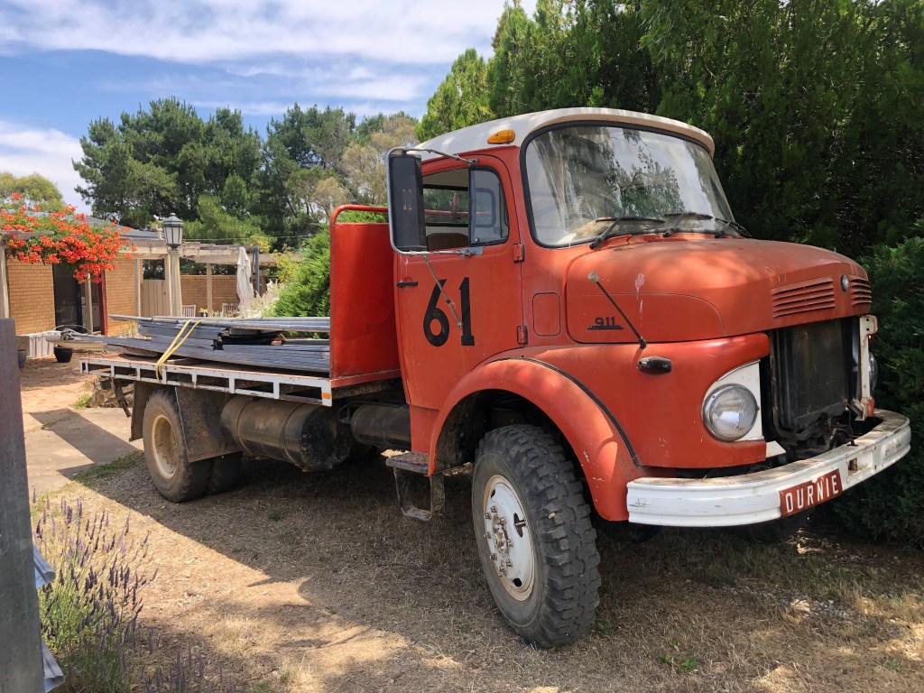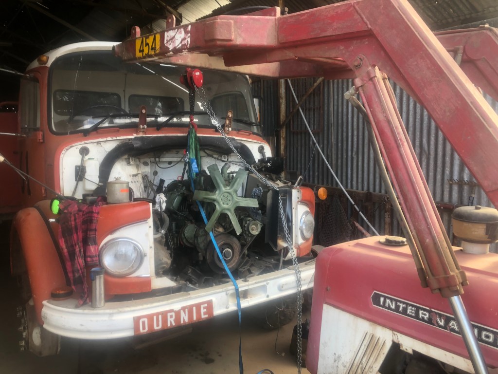 One of the things I enjoy about living on the Rock Farm is the range of problems I come across. From animal welfare and soil management, to rural plumbing and fencing repairs, I love the process of learning new skills. Regular readers will know, last August, I drowned the engine of our old LA911 Benz, Myrtle, attempting to cross our creek. With pride bent along with the conrods, I was in need of a new engine for our red ;drawbridge’. One of our neighbours collects old trucks and offered to sell me an engine out of a similar truck, a Benz 1217 Tipper.
