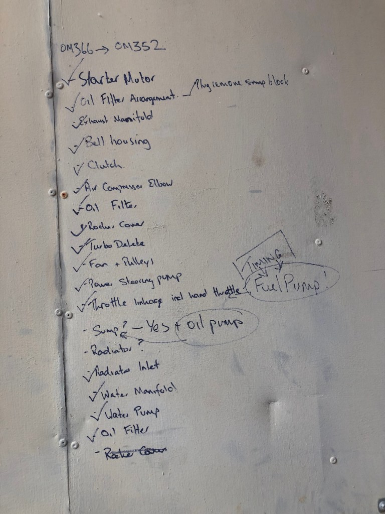 An initial check seemed promising, however after consulting the Mercedes Kurzhauber (short bonnet) Facebook group I realised I had incorrectly identified the donor engine as a turbo charged version of the the OM352. It wasn’t. It was an OM366 – a much modified variant that shared little with my engine except the block. Perhaps with the ignorance caused through auto-translate from German Engineers active on the Facebook group, I figured that it shouldn’t be too hard to make the engine fit. After all I had nothing to lose.
