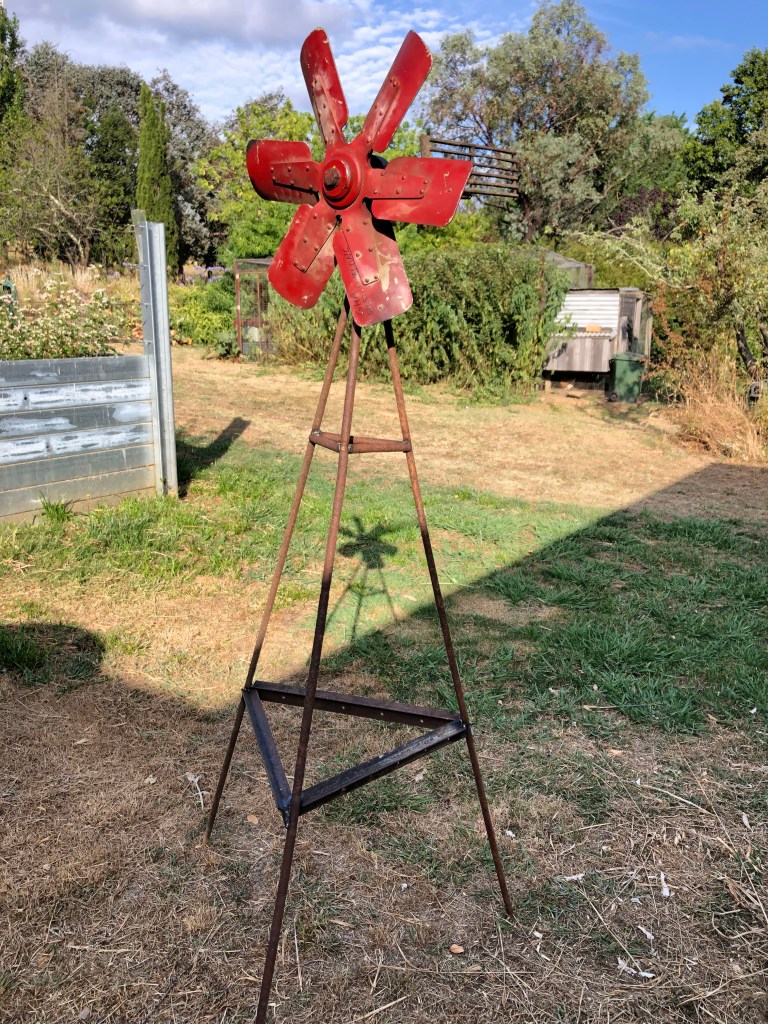 The truck was pressed straight back into service – moving old roofs of iron sheeting to make new compost bins. And the not-so-little welder was commissioned to make a feature out of the donor engine’s fan. He did a great job fashioning a windmill out of some scrap steel.