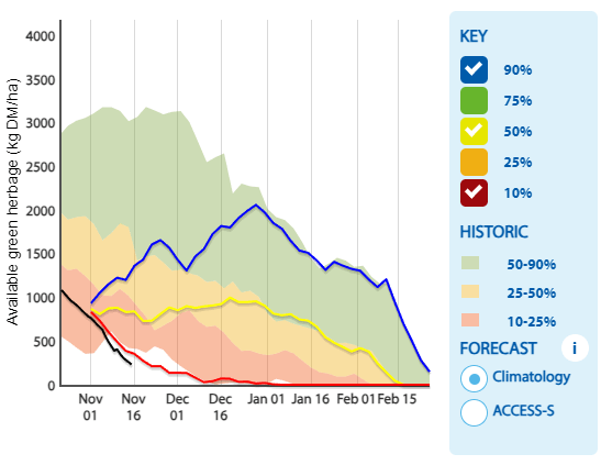 From https://www.farmingforecaster.com.au/index Projected green herbage available relative to historic variation – Murrumbateman. Accessed 21 November 2023