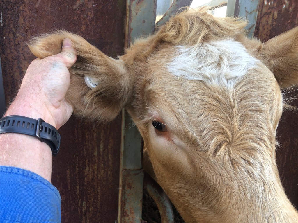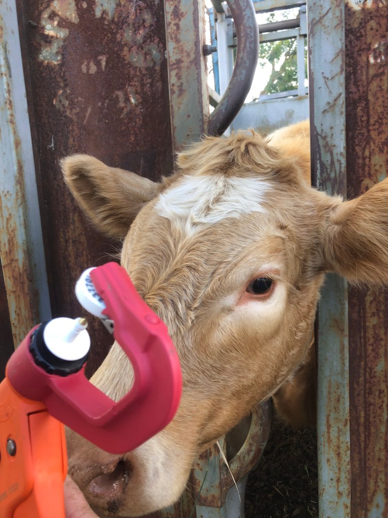 In the meantime our beautiful weaners have continued to grow. Sadly, the irregular rain, and not much grass growth this autumn means we will be unable to feed them over winter. They will be heading to the sale yards later this week. We have decided to keep three heifers, which we will return to the herd of 12 cows. Part of the requirements to sell cattle, is that they must be able to be traced back to the farm of origin. To do this, we fit them with an electronic ear tag with a RFID chip linked to the Rock Farm. They soon all sported the latest fashion accessory, a lovely white ear tag.