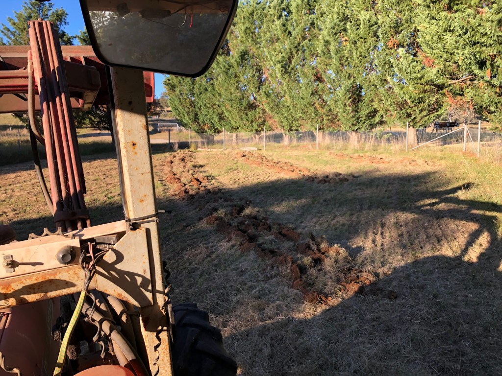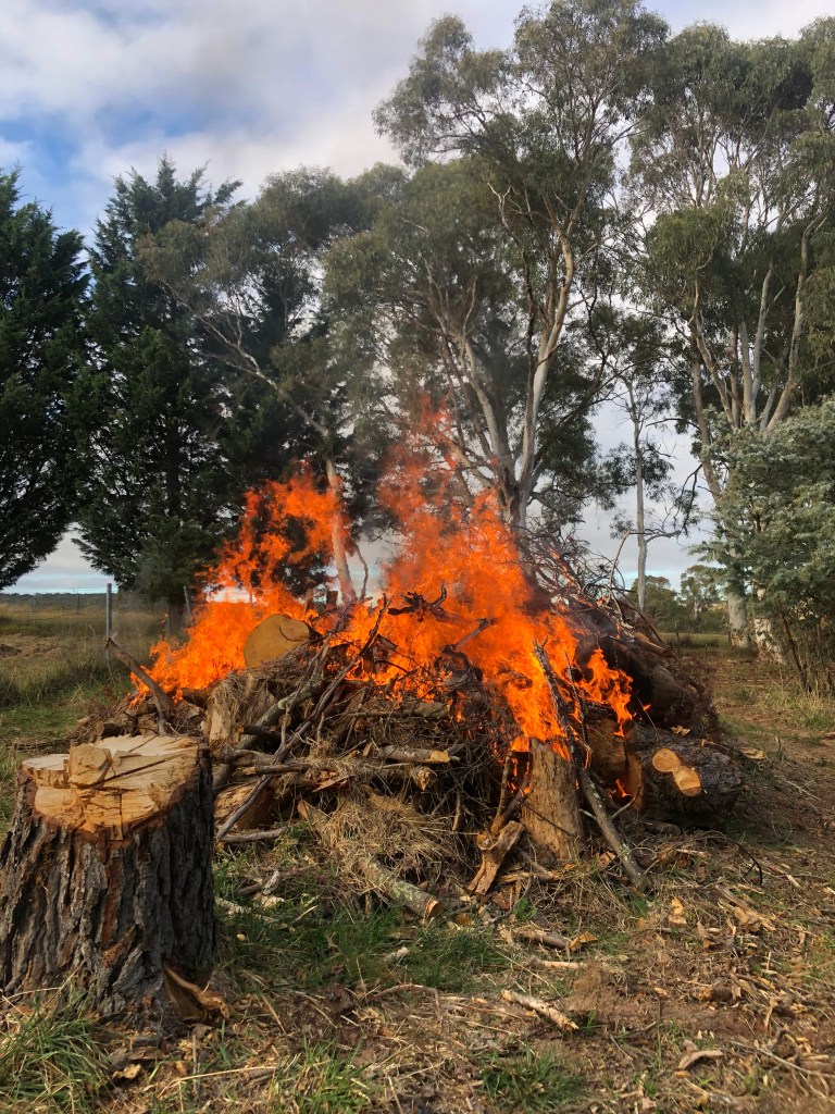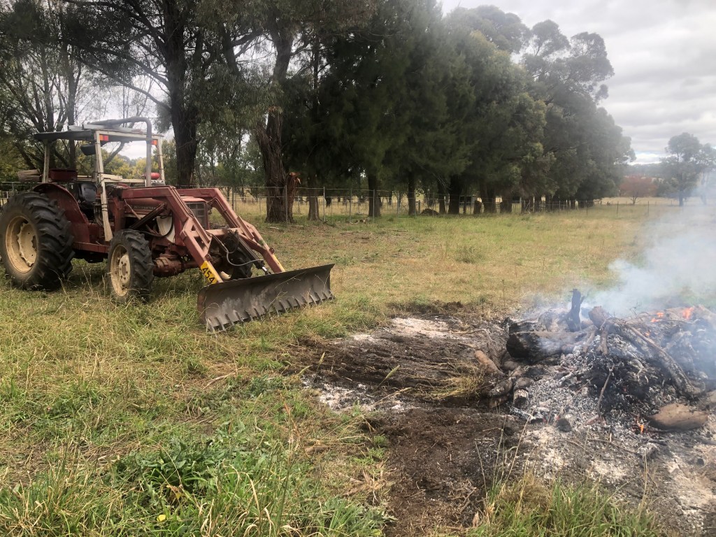 The rain also softened the ground, allowing me to rip contour lines for Jo’s new orchard. We have chosen to re-purpose one of the small foaling paddocks near the house for the orchard. The main reason for this site is that it is close to the house, close to an existing water pipe, and will probably be the easiest place on the farm to net in order to keep birds off the fruit. Of course it is not just simply ‘rip lines and the job is done’. The first thing I had to do was service the tractor. This was complicated by the fact I needed to fit a new fuel cock first to allow me to change the fuel filters first. Then I slashed the paddock, before ripping along the contours. I also needed to fell three nearby pine trees that had died. I removed most of the branches, but I had to wait for appropriate weather window to burn the stumps.