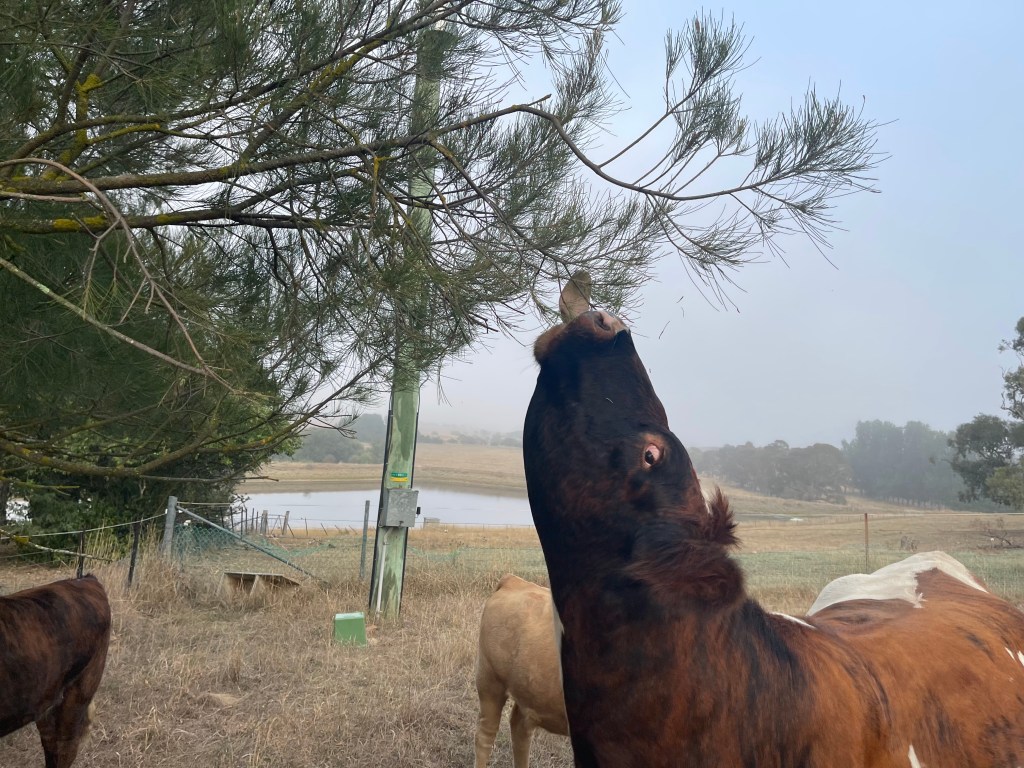 In my last post, I was grateful that some summer storms had helped the pastures along. The Rock Farm was looking surprisingly green for Christmas—an exception rather than the norm in this part of the world. By the end of January, however, it was clear that things were drying out. So, like all good husbands, I packed up and went to sea for a couple of weeks, leaving the farm and livestock in Jo’s capable hands. Before I left I pre-positioned a couple of hay bales in the paddocks to ensure the cattle had feed ahead of them—but I wasn’t prepared for what I found when I got home.