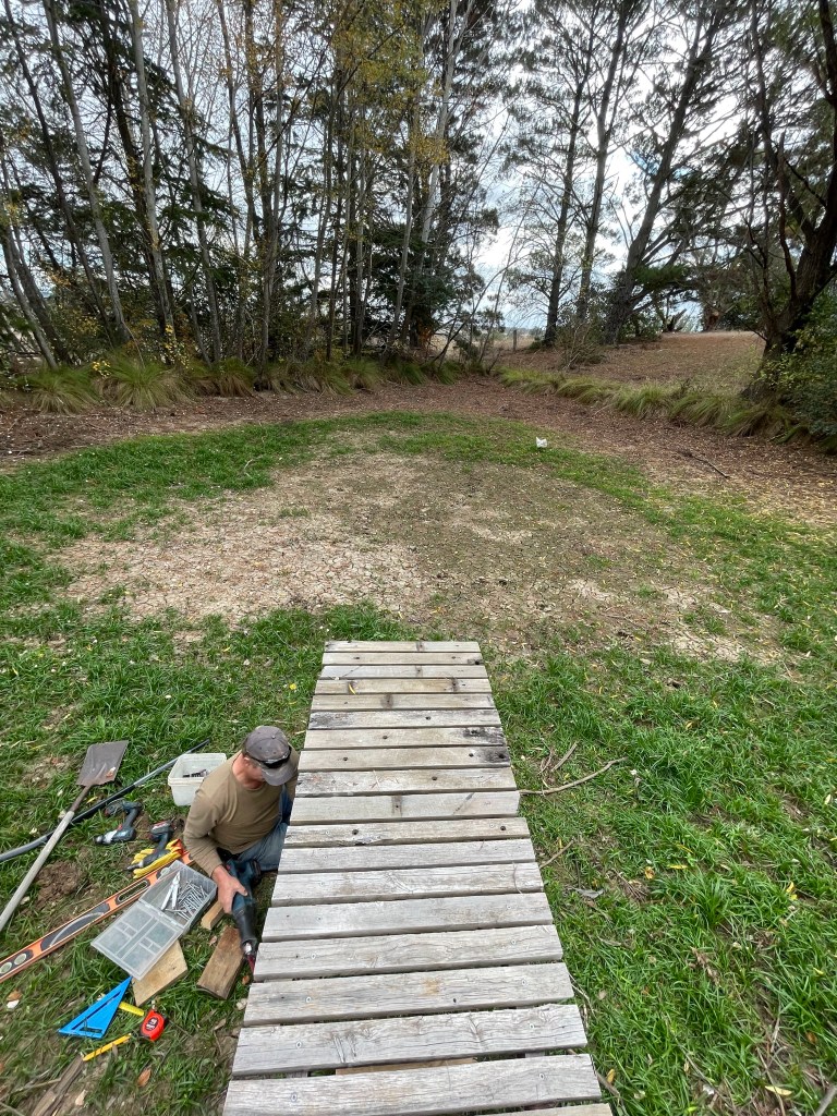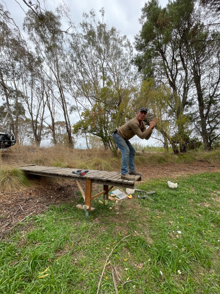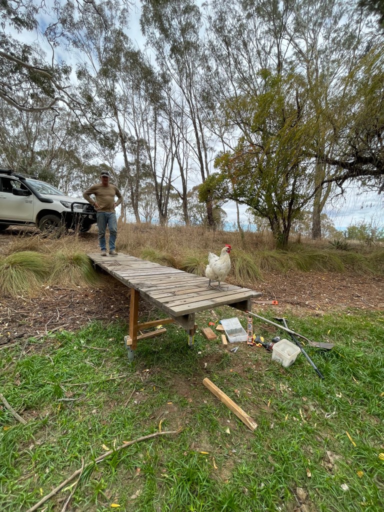 One advantage of the dry weather is that the little dam in our garden dried out. For many years, I’d promised Jo a jetty. I even managed to construct the deck a while back. Running fast out of excuses—and with the youngest Helper back from university—we got it installed, much to the one remaining chicken’s satisfaction. Result: one happy wife… and chicken!