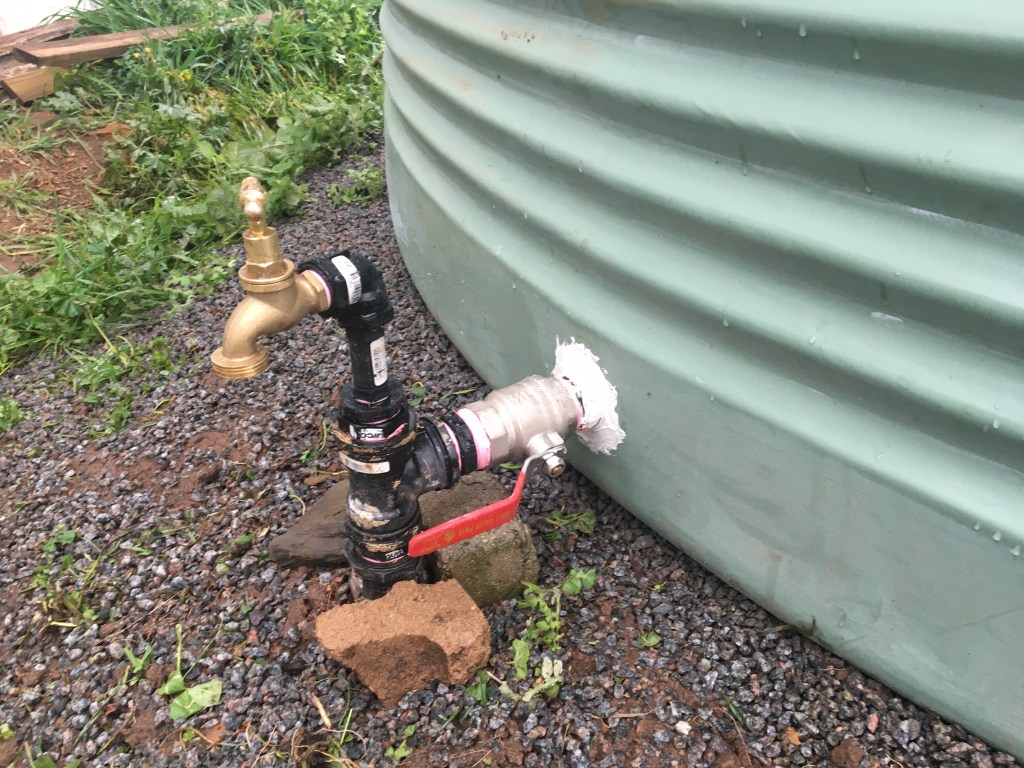 The next step is to put a drain in the beds. We used a 12mm irrigation pipe, protected by a 19mm pipe. Some old pantyhose over the end stops mosquitoes from breeding in the beds.